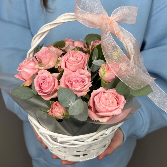 Роза кустовая пионовидная – 4 шт.Корзина плетеная – 1 шт.комплимент от polyanka – 1 шт.