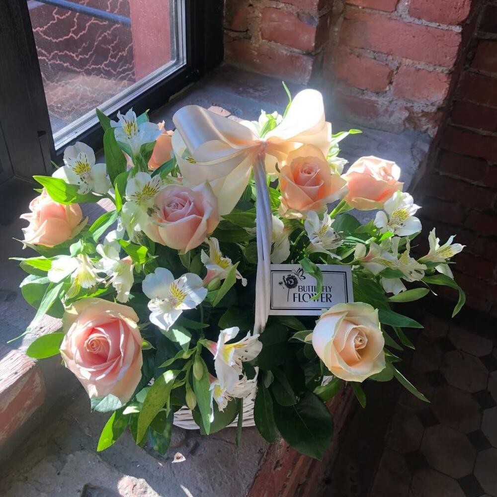 Корзина плетеная – 1 шт.Оазис – 2 шт.Зелень – 5 шт.Альстромерия – 6 шт.Роза – 7 шт.Лента атласная – 1 шт.