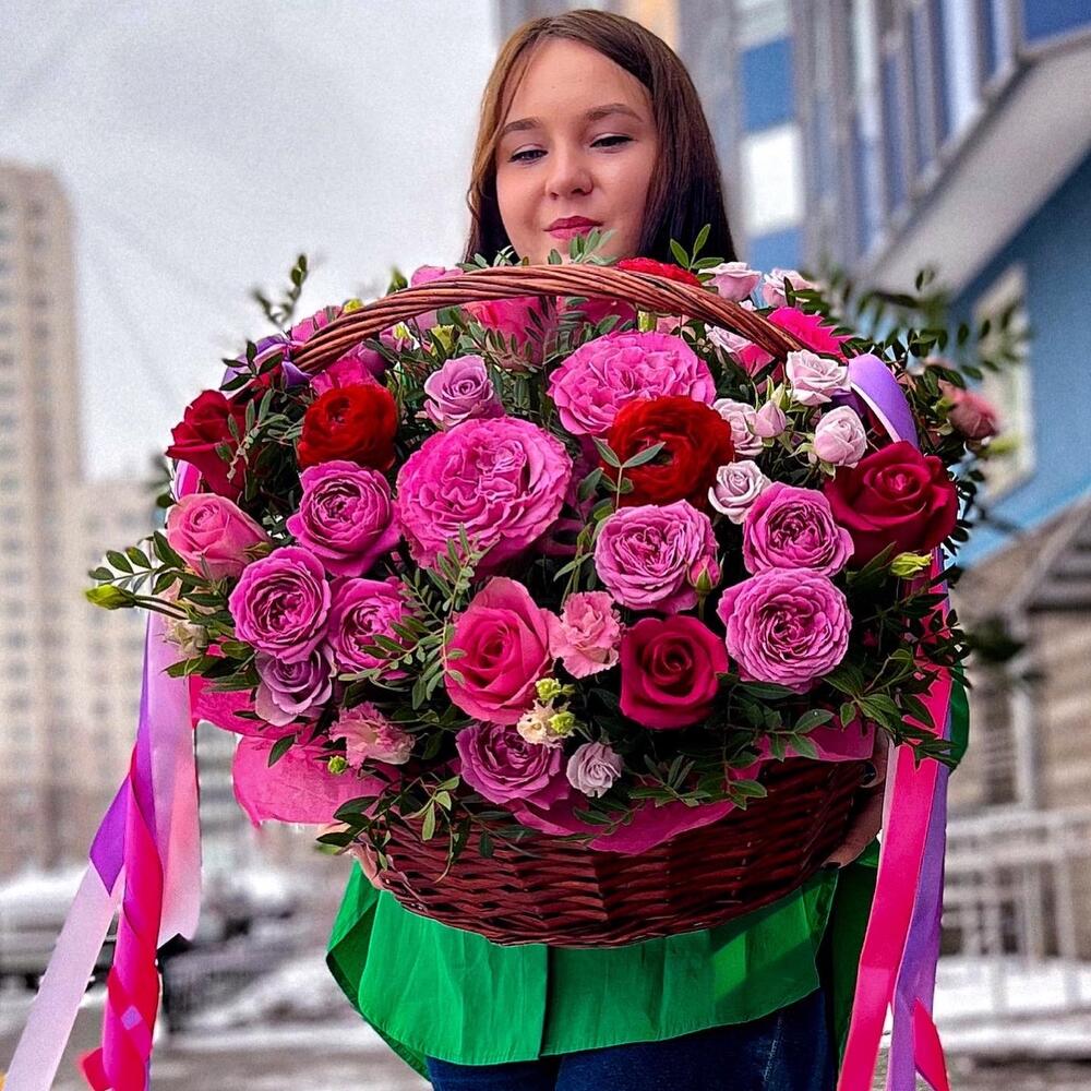 Корзина плетеная – 1 шт.Оазис флористический – 3 шт.ленты атласные – 6 шт.Фисташка – 9 шт.Ранункулюс – 3 шт.Эустома – 5 шт.Роза пионовидная – 5 шт.роза Misty Bubbles пионовидная – 6 шт.Роза кустовая – 4 шт.Роза одноголовая – 15 шт.