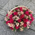Роза – 25 шт.Альстромерия – 20 шт.Рускус – 15 шт.Оазис флористический – 2 шт.Корзина плетеная – 1 шт.