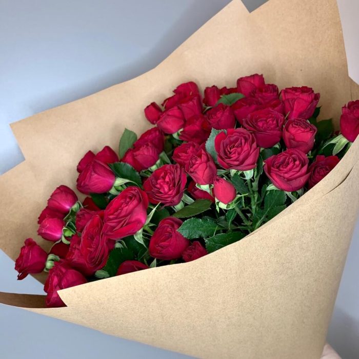Роза кустовая – 15 шт.Лента атласная – 2 шт.Крафт – 2 шт.