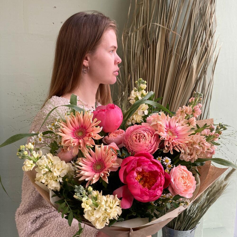 Пион – 2 шт.Роза кустовая пионовидная – 1 шт.матилла – 5 шт.гербера кучерявая – 3 шт.паникум грас – 3 шт.Ромашка кустовая – 2 шт.Фисташка – 3 шт.Упаковка дизайнерская – 1 шт.Лента атласная – 1 шт.