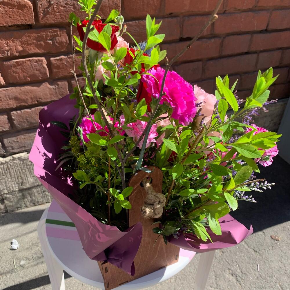 Роза пионовидная – 5 шт.Лизиантус – 1 шт.Эрингиум синий – 1 шт.Диантус – 5 шт.Диантус кустовой – 2 шт.Лимониум – 1 шт.Маттиола – 1 шт.Писташ – 4 шт.Тюльпан – 2 шт.Оазис флористический – 1 шт.Ящик деревянный – 1 шт.