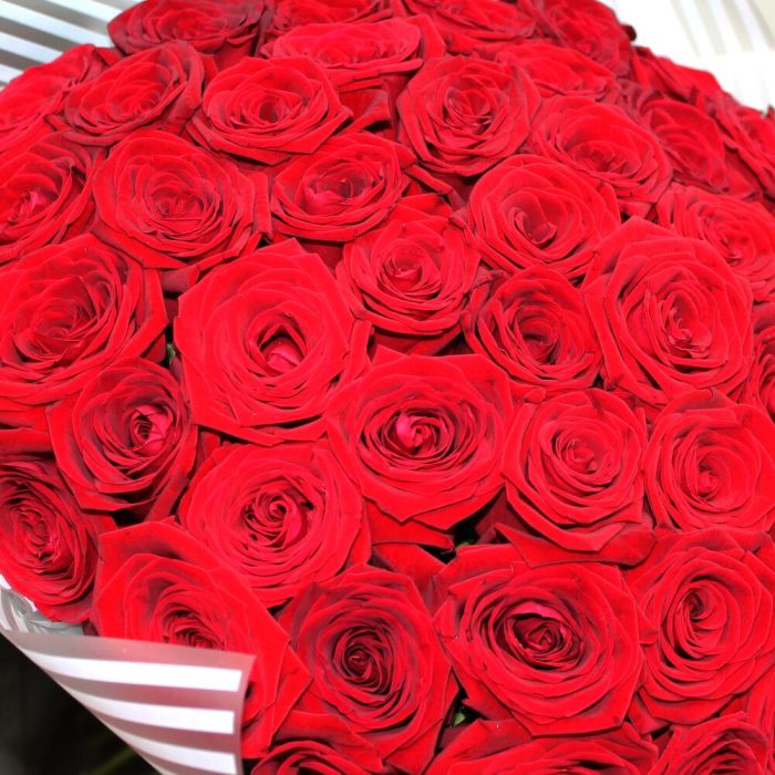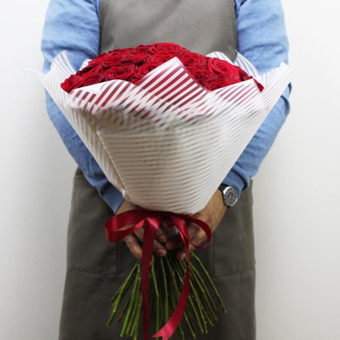 Лента атласная – 2 шт.Красная роза – 51 шт.Дизайнерская упаковка – 3 шт.инструкция по уходу за цветами – 1 шт.любовь флориста (бесплатно) – 1 шт.подкормка для цветов chryzal – 1 шт.