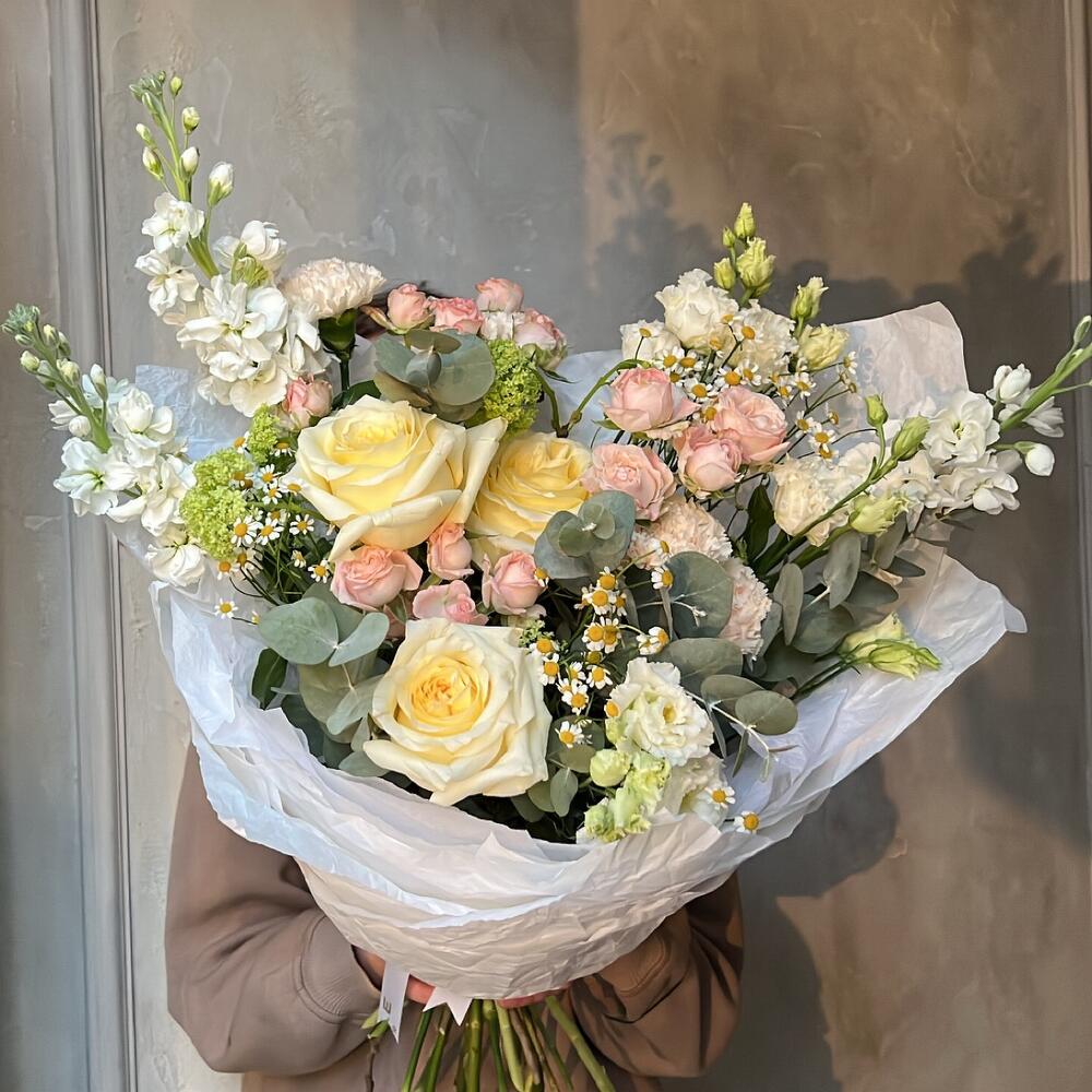 Роза пионовидная – 3 шт.Матрикария (Ромашка Камила) – 3 шт.Роза кустовая пионовидная – 3 шт.Маттиола – 3 шт.Эвкалипт – 1 шт.Вибурнум – 2 шт.Лизиантус – 2 шт.Упаковка дизайнерская – 1 шт.