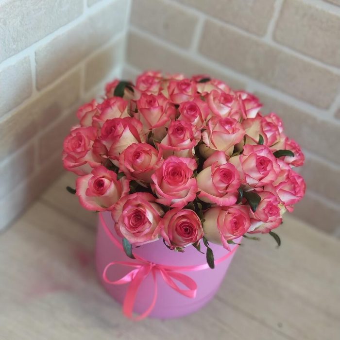 Лента атласная – 1 шт.Коробка шляпная – 1 шт.Роза Джумилия – 29 шт.Оазис флористический – 1 шт.