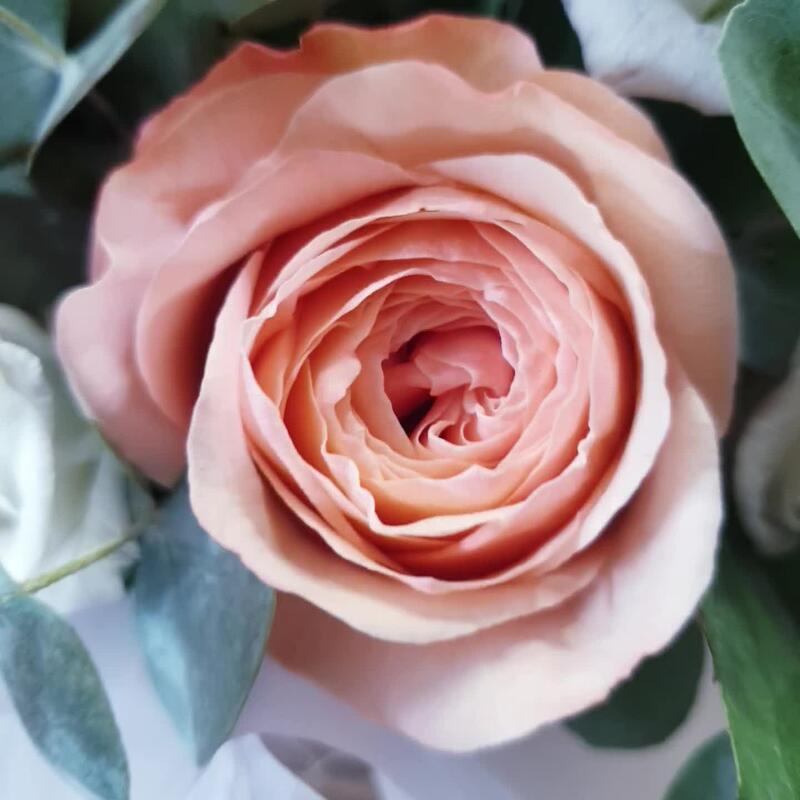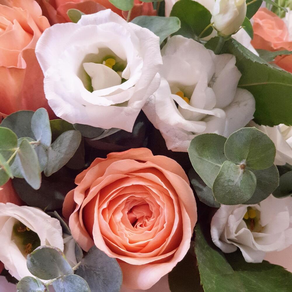 Роза Капучино – 7 шт.Лента органза – 1 шт.Открыточка с вашими пожеланиями – 1 шт.Лизиантус Алиса белый – 4 шт.Оазис флористический – 1 шт.Эвкалипт Baby Blue – 3 шт.коробка шляпная крафт – 1 шт.рафия натуральная лента – 1 шт.любовь флориста (бесплатно) – 1 шт.