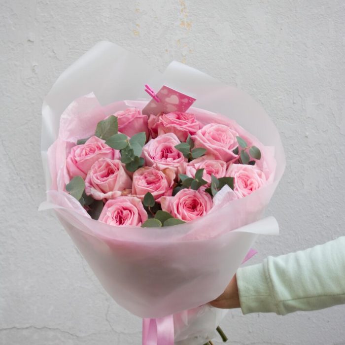Пионовидная роза – 11 шт. Эвкалипт цинерария – 2 шт.