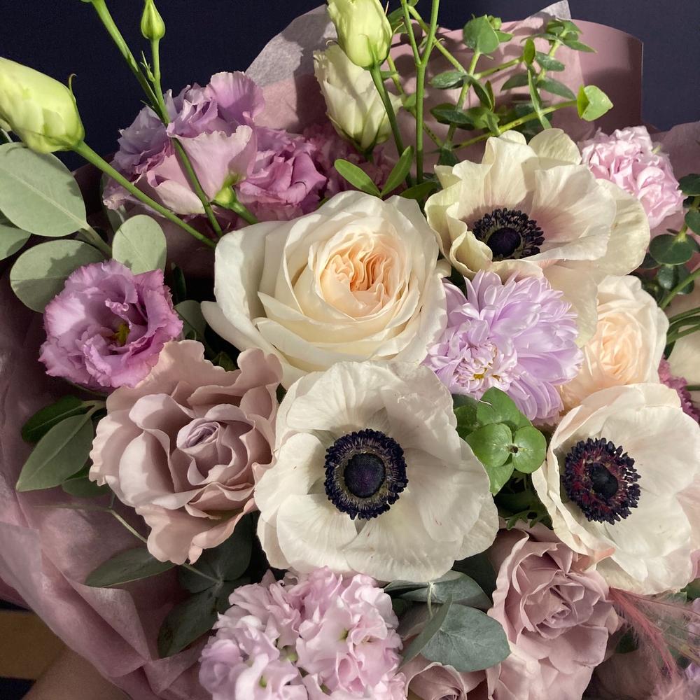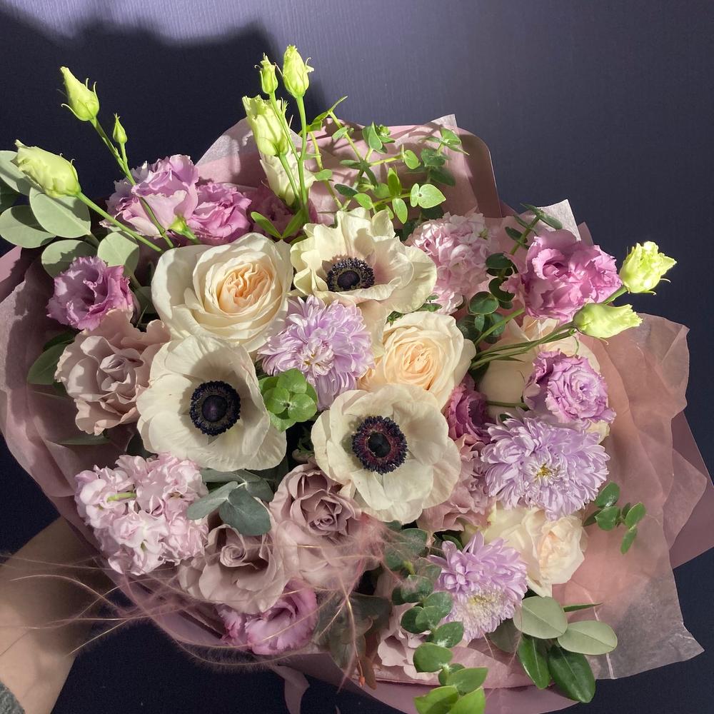 Авторский букет с анемонами, лизиантусом, ковылем, пионовидными розами, эвкалиптом, астрами и маттиолой.Стильное цветочное решение для любого случая.