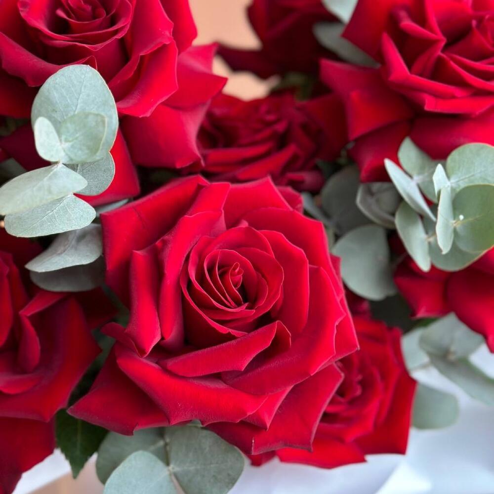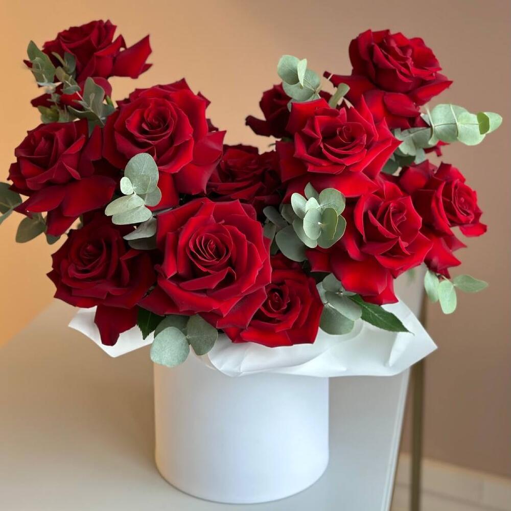 Роза красная Эквадор – 15 шт.Эвкалипт – 2 шт.Фисташка – 2 шт.Шляпная коробка – 1 шт.Флористическая губка (оазис) – 1 шт.
