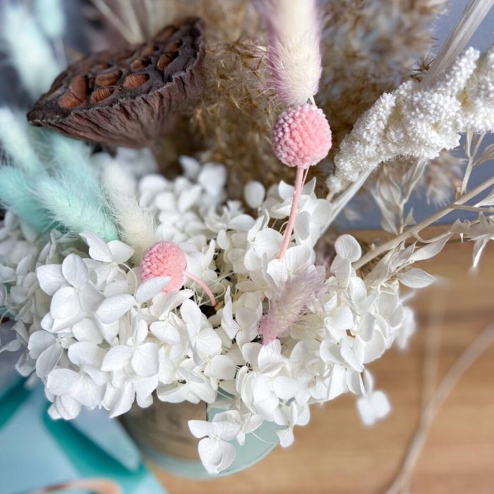 гортензия белая стабилизированная – 1 шт.Лотос (коробочка) – 1 шт.ковыль (пучок) – 1 шт.сетария сухоцвет – 1 шт.иглица – 1 шт.краспедия розовая – 2 шт.Лагурус (сухоцвет) – 16 шт.камыш крашенный – 1 шт.пампасная трава – 1 шт.банка жестяная – 1 шт.