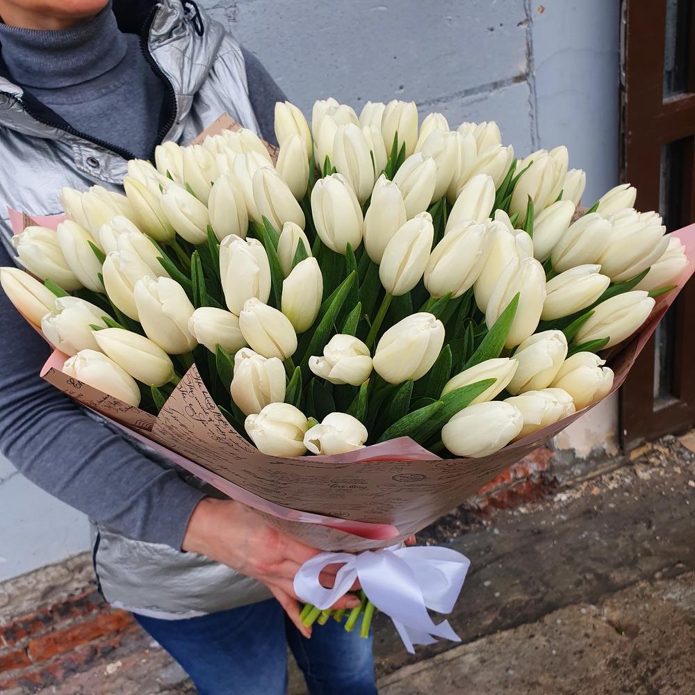 Букет 101 белый тюльпан в дизайнерской упаковке