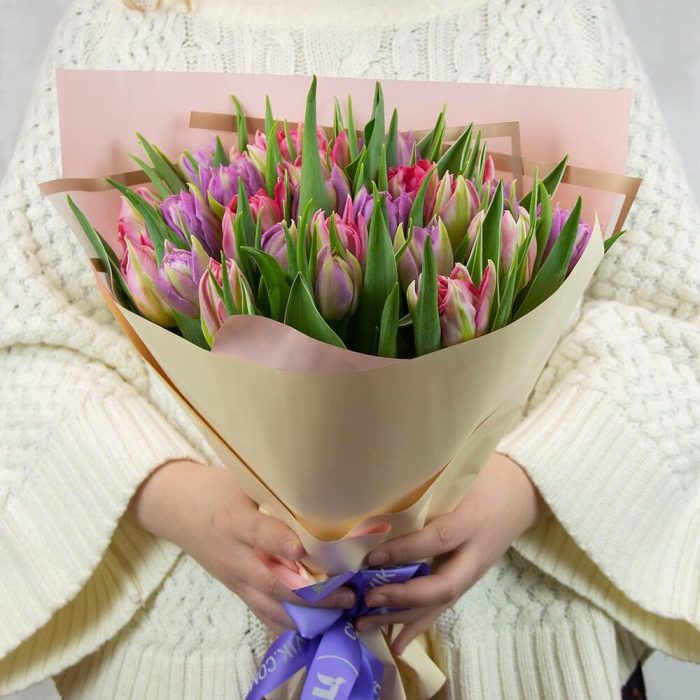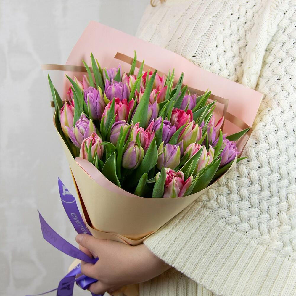 Букет из 25 тюльпанов пионовидных микс в дизайнерской упаковке