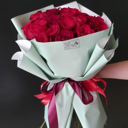 Коробка Робкий поцелуй из роз сорта квинси, охара, эустомы, генисты и диантуса